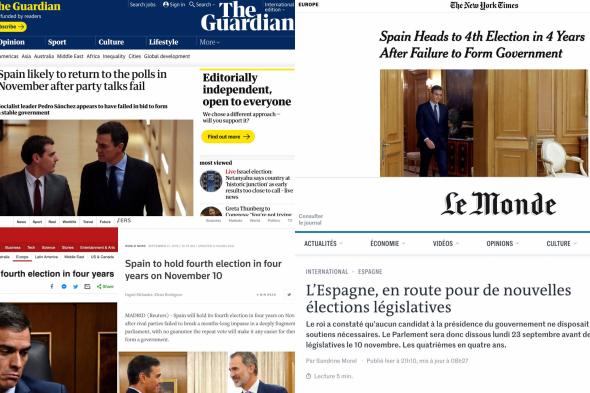 Cansados estamos en España de elecciones y cansada está la prensa internacional de tener que contar lo mismo: que no hay capacidad de acuerdo entre nuestros políticos. Los medios más importantes del mundo han relegado la noticia de una nueva convocatoria electoral, aunque todos coinciden en varias ideas: que cuatro elecciones en cuatro años ya son un síntoma de debilidad, que falta capacidad de diálogo y que, cuidado, pueden venir buenos tiempos para la ultraderecha.