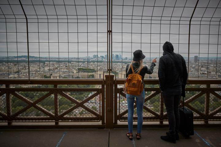 Dos turistas contemplan las vistas desde la recién abierta Torre EiffelKiran Ridley via Getty Images