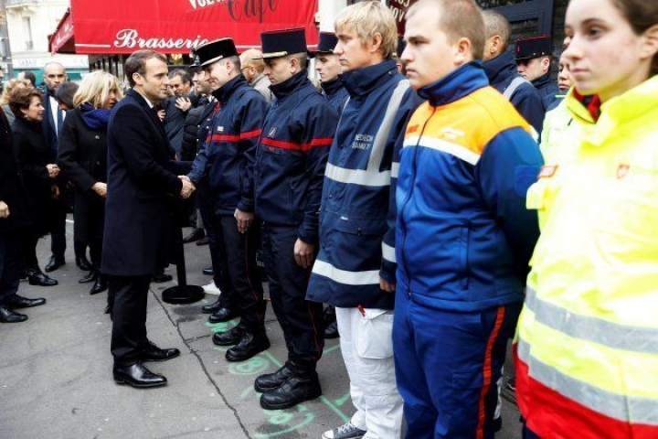 Emmanuel Macron y su esposa Brigitte saludan a miembros de los servicios de emergencia que actuaron el 13 de noviembre de hace dos años.EFE