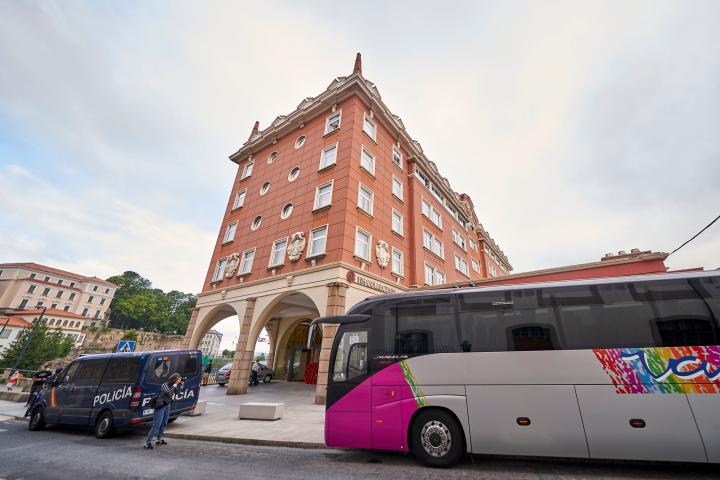 Autobús del Fuenlabrada junto al Hotel Finisterre, donde están aislados los jugadores. Quality Sport Images via Getty Images
