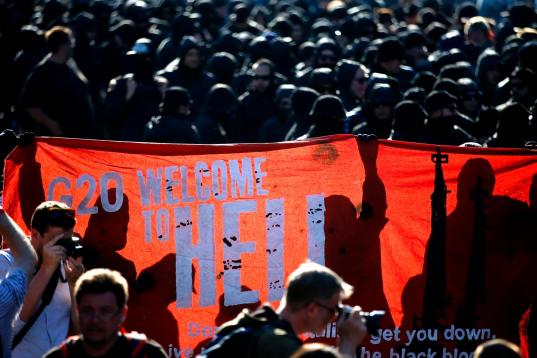 La marcha llevaba por lema 'Bienvenida al infierno' -'Welcome tu hell', en inglés- y había sido organizada por diversos colectivos, entre ellos el movimiento 'Rote Flora' -'Flora Roja'-, agrupados en torno a una casa ocupada cercana al centro de congresos donde se celebrará la cumbre.
