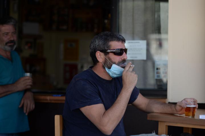 A man smokes while drinking beer at the terrace of a bar in Sevilla on August 13, 2020. - Spanish regions Galicia and Canary Islands attracting tourists introduced outdoor smoking bans to curb the coronavirus as a top domestic medical body calle...CRISTINA QUICLER via Getty Images