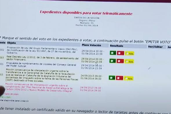 Además, este método de votación está conectado a una red interna del Congreso (intranet) y para poder acceder a este es necesario introducir una serie de credenciales personales conformadas por un usuario y una contraseña. Se trata de un software estructurado en el que el parlamentario puede ver la agenda de la jornada y la de sesiones anteriores, además de votar múltiples opciones en una misma selección. También empleando el mismo código de colores. Según ha dado a conocer El País, no existen precedentes en las Cortes de que el sistema haya fallado informáticamente ni de que se haya tenido que repetir un voto.