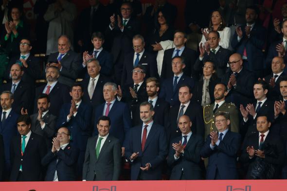 En la imagen, que ha dado que hablar en las redes sociales, aparece el rey Felipe VI rodeado de otras autoridades como el presidente de la Junta de Andalucía, Juanma Moreno; el presidente de la Real Federación Española de Fútbol, Luis Rubiales; el presidente de la Comunidad Valenciana, Ximo Puig; o el ministro de Cultura y Deportes, Miquel Iceta.