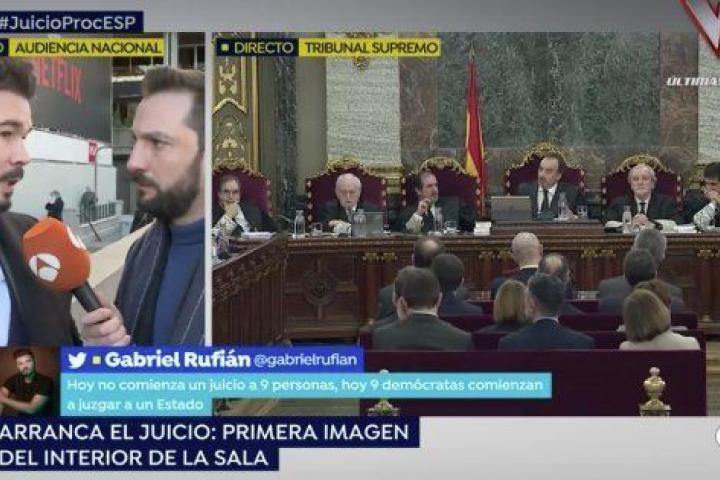 El portavoz del partido independentista atendía a los medios para hablar del juicio al 'procés', que durará aproximadamente unos tres meses. La mayoría de los imputados están acusados de delitos de rebelión y/o sedición así como de malversación. Momentos antes de entrar en directo, una persona se dirigía a Rufián y le decía: "A ver si hay suerte y acabas en la cárcel".