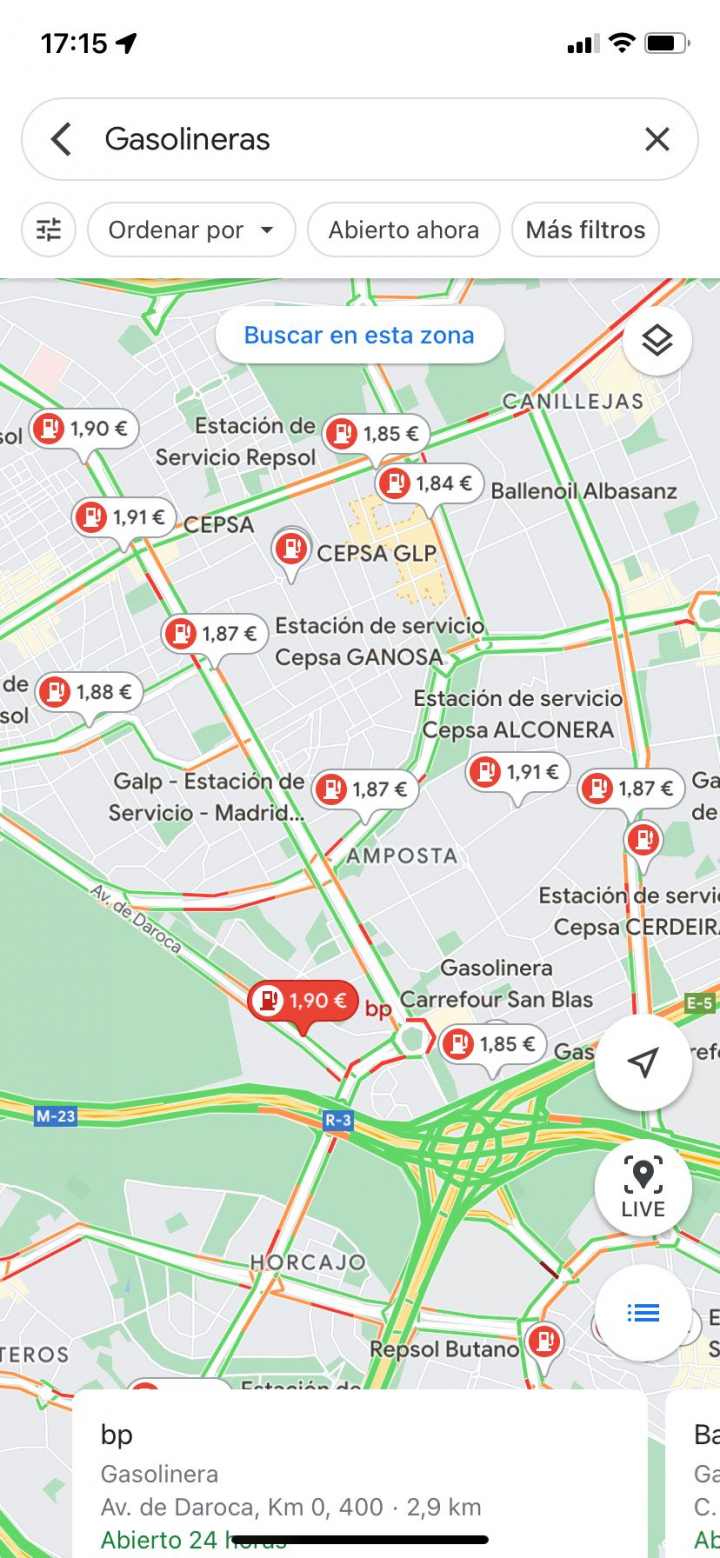Desde hace un año Google Maps incluye la opción de teclear “Gasolineras” en la zona que se desee o pinchar directamente en el filtro “Gasolineras” y sobre el mapa se pintará el precio de la Sin Plomo 95 en cada estación —ojo, es posible que no todas faciliten el dato—.