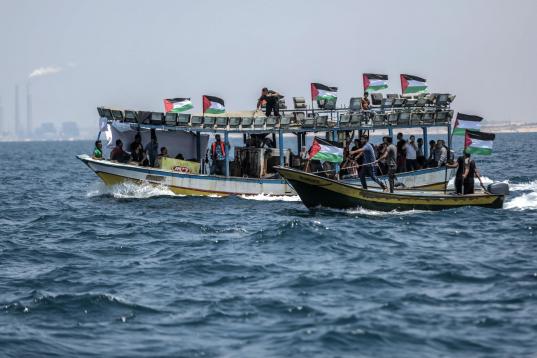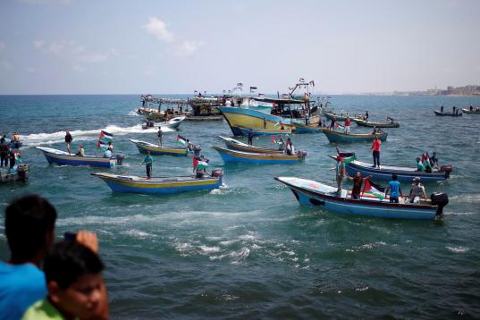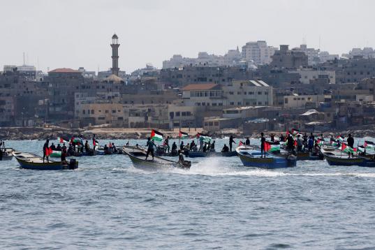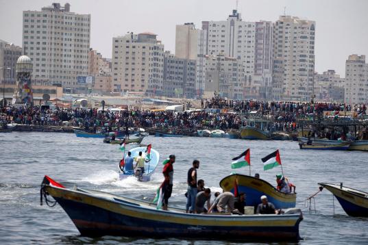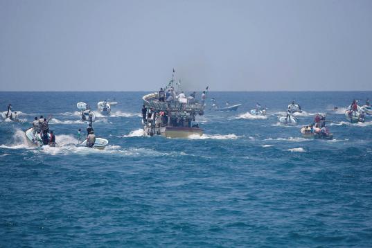 Un barco fletado con periodistas y decenas de pequeñas embarcaciones acompañaron a la Flotilla hasta los límites impuestos por Israel por el bloqueo terrestre, aéreo y marítimo que mantiene sobre Gaza desde que Hamás se hiciera con el poder por la fuerza en 2007 tras expulsar a las milicias del movimiento nacionalista Al Fatah.
