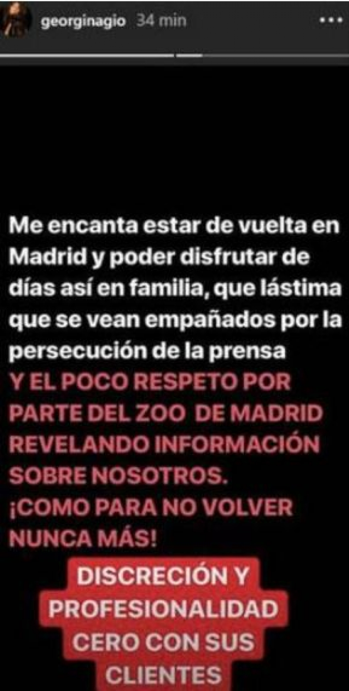 “Me encanta estar de vuelta en Madrid y poder disfrutar de días así en familia, qué lástima que se vean empañadas por la persecución de la prensa. Y el poco respeto por parte del Zoo de Madrid revelando información sobre nosotros. ¡Cómo para no volver nunca más! Discreción y personalidad cero con sus clientes”, ha publicado.