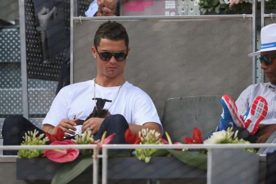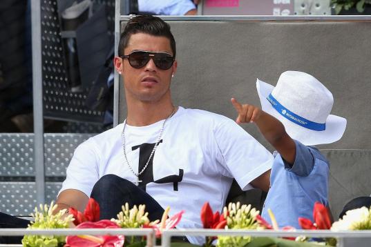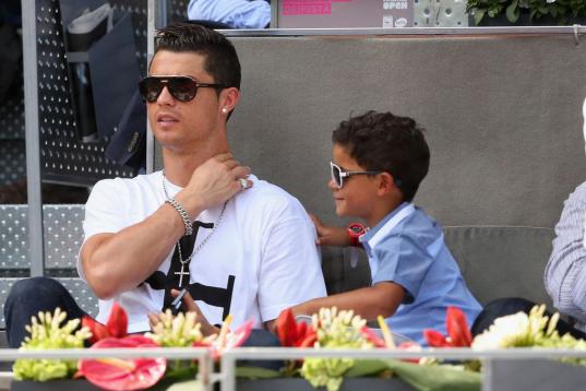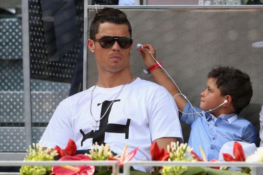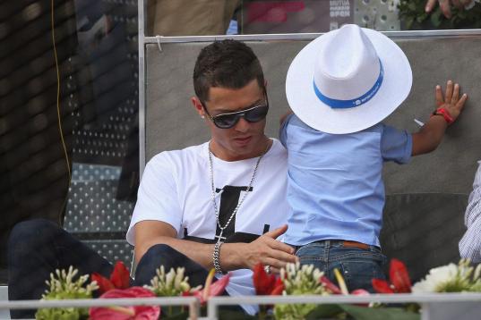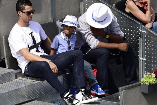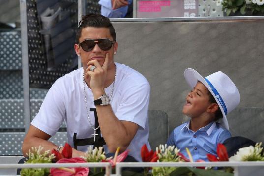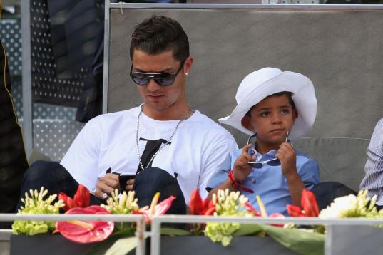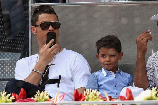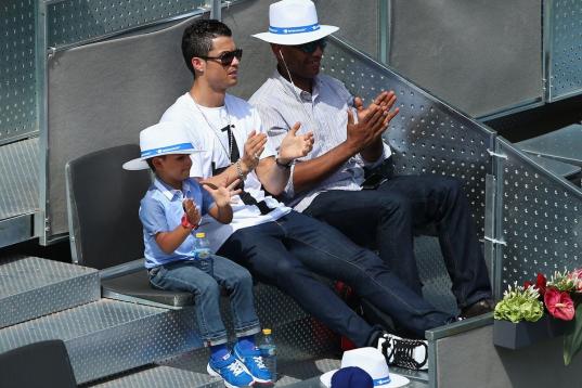 Cristiano Ronaldo llevó a su hijo, Cristiano Ronaldo Jr., al mirar el juego del Abierto de Madrid entre Rafael Nadal y Jarkko Nieminen, el 8 de mayo.