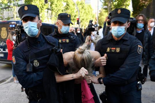 La Policía detiene a una activista de Femen que protestaba en el colegio electoral en el que iba a votar la candidata de Vox, Rocío Monasterio.