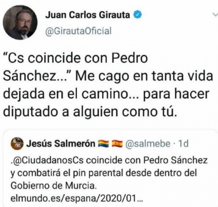 Mensaje que ha borrado tras la respuesta que recibió de Girauta: ”‘Cs coincide con Sánchez...’ Me cago en tanta vida dejada en el camino... para hacer diputado a alguien como tú”.
