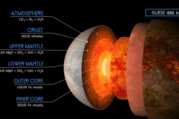 Según los cálculos, Gliese 486b tiene un núcleo de hierro proporcionalmente más pequeño que el de la Tierra y está rodeado “por un manto profundo hecho de silicatos y, quizás, agua”.