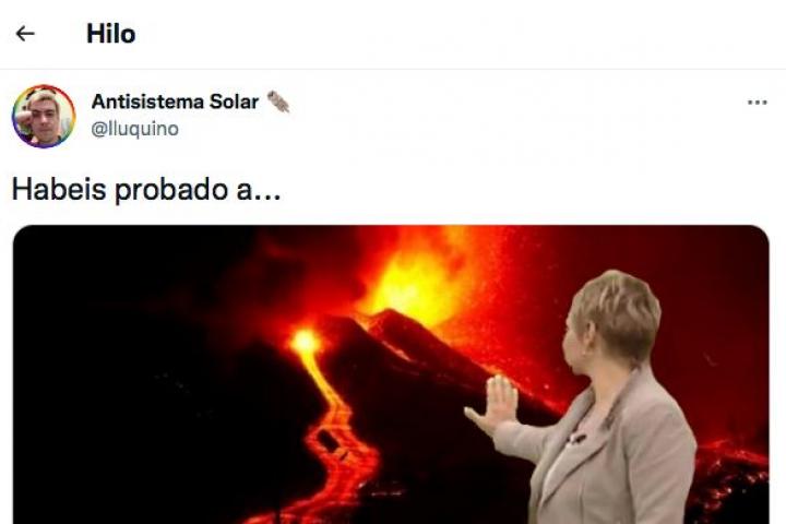 Un montaje recorre en los últimos días Twitter. En él se ve a Glòria Serra, presentadora de Equipo de Investigación de La Sexta, girada hacia el volcán de La Palma. Junto a esa imagen, el usuario @lluquino ha escrito: “Habéis probado a...”.