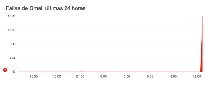 La web Downdetector, que refleja en tiempo real las caídas de las grandes plataformas tecnológicas, mostraba a las 13:00 un gran pico en el registro de incidencias de dichos servicios. Esta es el ejemplo del correo de Google, Gmail: