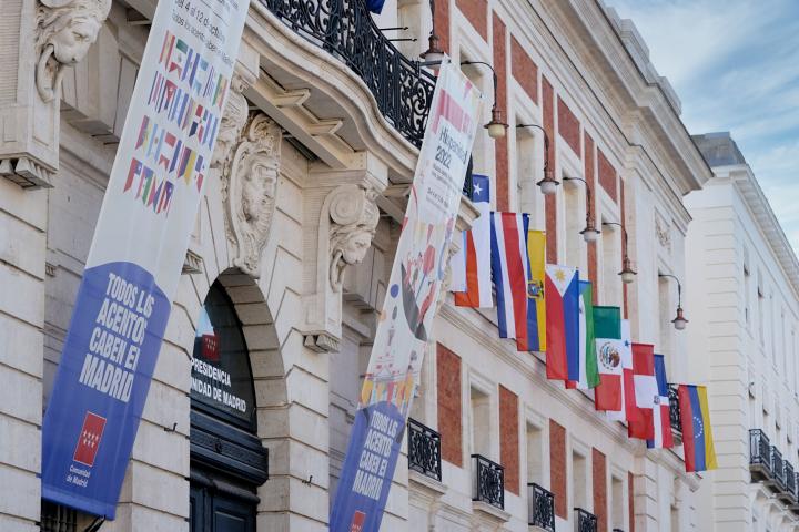 La Comunidad de Madrid ha instalado este domingo en la fachada principal de la Real Casa de Correos, sede del Gobierno regional, las banderas de los 22 países hispanohablantes, con motivo de la Hispanidad 2022.
