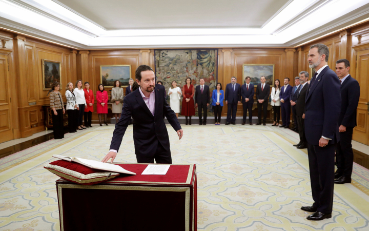 El nuevo vicepresidente de Derechos Sociales y Agenda 2030, Pablo Iglesias jura su cargo durante la jura de ministros del nuevo gobierno en un acto celebrado en el Palacio de Zarzuela en Madrid este lunes 13 de enero de 2020