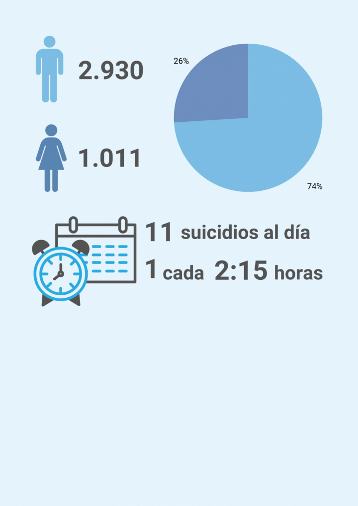 Esto supone que el pasado año se suicidaron una media de 11 personas al día, es decir, una cada dos horas y cuarto. En cuanto a sexos, en 2020 se suicidaron 2.930 hombres y 1.011 mujeres.