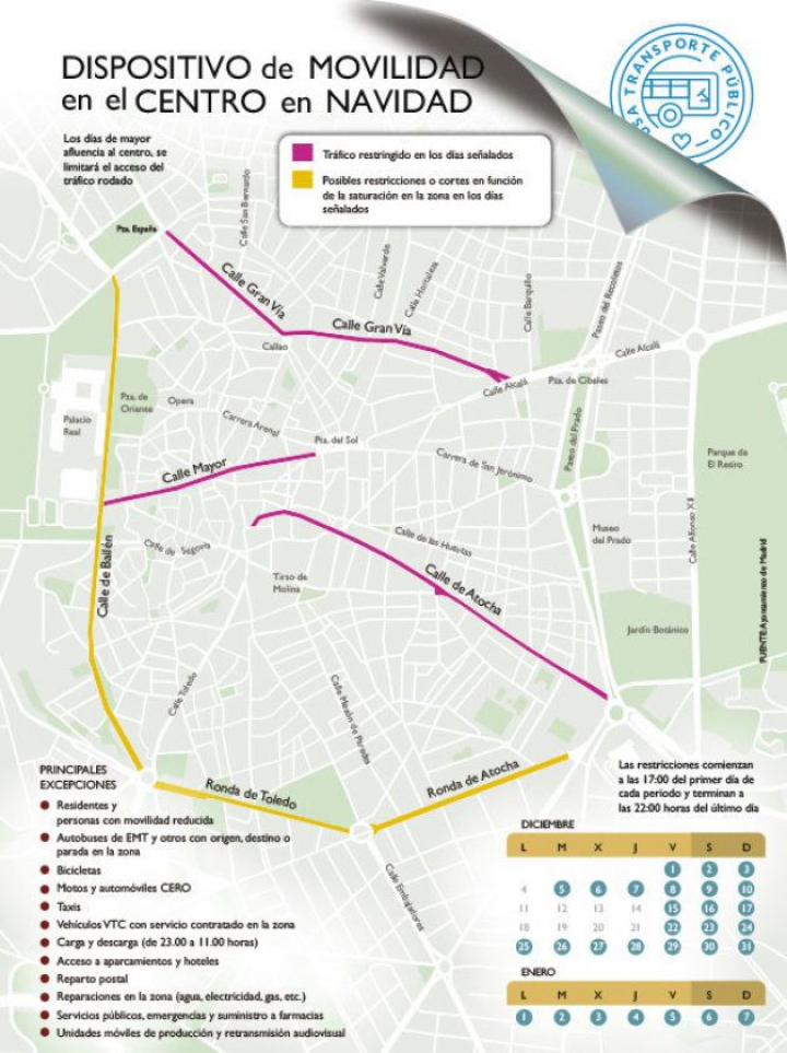 El dispositivo de movilidad incluye limitaciones de acceso -excepto para residentes y vehículos autorizados- en Gran Vía, Puerta del Sol y las calles Mayor y Atocha en las fechas de mayor afluencia a esta zona. El calendario coincide con los fines de semana, el puente de diciembre y el periodo de vacaciones escolares. Las restricciones al tráfico en cada periodo de aplicación de las medidas comenzarán a las 17 horas el primer día y finalizarán a las 22 horas del último.