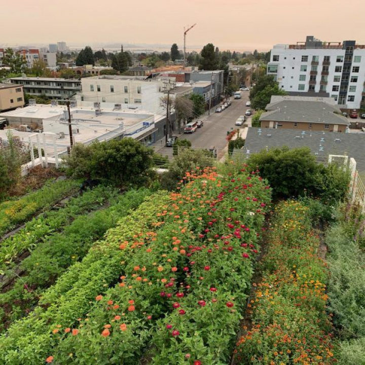 Una granja de flores en lo alto de la azotea de una gran ciudad