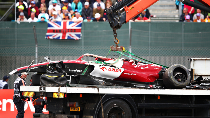 El inicio del Gran Premio de Gran Bretaña ha dejado una imagen que pone los pelos de punta. El piloto chino Guanyu Zhou ha sufrido un grave accidente que le ha dejado boca abajo durante varios metros a gran velocidad.
