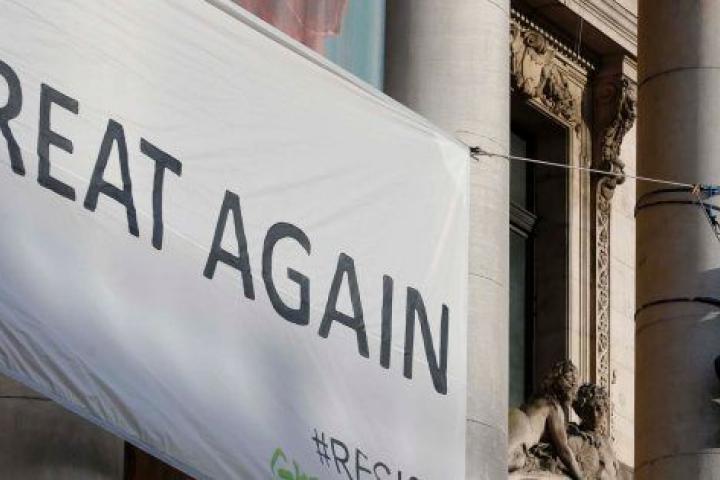 Ya lo hicieron cuando el presidente de EEUU, Donald Trump, acababa de instalarse en la Casa Blanca. Aquel mes de enero en el que medio mundo seguía consternado por su elección, Greenpeace llamó a "resistir" con una enorme pancarta que colgaron a escasos metros del emblemático edificio. Ahora, este jueves, lo han vuelto a hacer, esta vez en Bruselas.