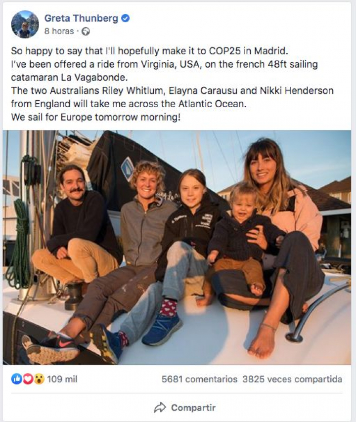 Según ha relatado, dos australianos y una inglesa le han ofrecido cruzar el Océano Atlántico a bordo del catamarán “La Vagabonde”, de 84 pies de eslora (25,6 metros de largo). “Muy contenta de poder decir que con suerte llegaré a la COP25 en Madrid”, ha indicado.