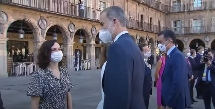 A la llegada de Felipe VI, se han comenzado a escuchar numerosos ”¡viva el rey!” en la Plaza Mayor salmantina. Los vítores se han alargado durante las distintos saludos que se sucedían, pero ha tenido lugar un momento muy curioso cuando al rey le tocaba dirigirse a la presidenta de la Comunidad de Madrid, Isabel Díaz Ayuso.