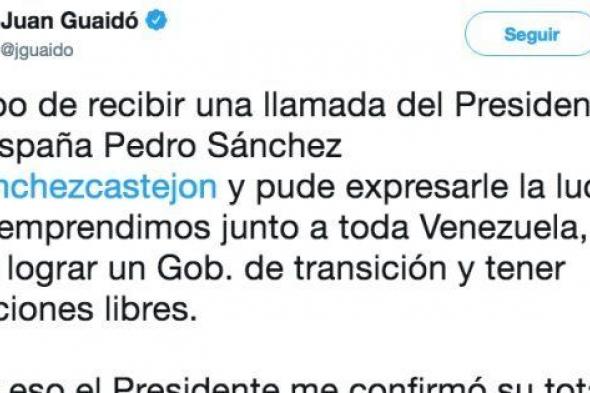 Guaidó se ha pronunciado en Twitter tras hablar por teléfono con Sánchez, que le ha llamado desde el Foro Económico Mundial de Davos (Suiza). "Pude expresarle la lucha que emprendimos junto a toda Venezuela, para lograr un Gobierno de transición y tener elecciones libres", ha declarado.