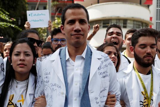 Opposition leader and self-proclaimed 'acting president' Juan Guaido (C), marches surrounded by students during a protest he convened against the government of President Nicolas Maduro, outside Venezuela's Central University (UCV) in Caracas, on...