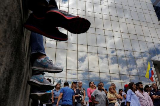 Demonstrators demand humanitarian aid during a protest against the government of President Nicolas Maduro, called by opposition leader and self-proclaimed 'acting president' Juan Guaido, outside the 'Dr. JM de los Rios' Children's Hospital in Ca...