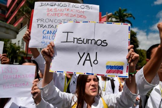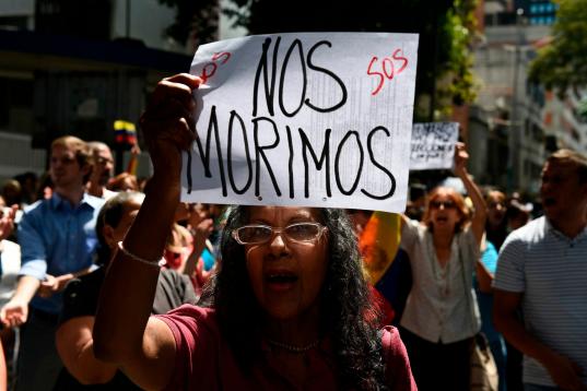 A demonstrator holds a sign reading 'We do die', during a protest against the government of President Nicolas Maduro, called by opposition leader and self-proclaimed 'acting president' Juan Guaido, outside the 'Dr. JM de los Rios' Children's Hos...