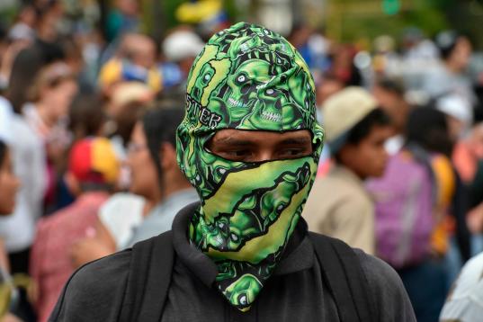 A masked opposition demonstrators takes part in a protest against the government of President Nicolas Maduro, called by opposition leader and self-proclaimed 'acting president' Juan Guaido, at Altamira square in Caracas on January 30, 2019. - Ve...