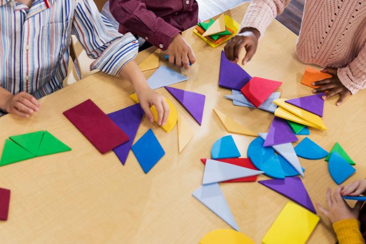 Cropped, high angle view of a multi-ethnic group of four children in kindergarten or first grade sitting at a table in a classroom at school, playing with colorful shapes.kali9 via Getty Images