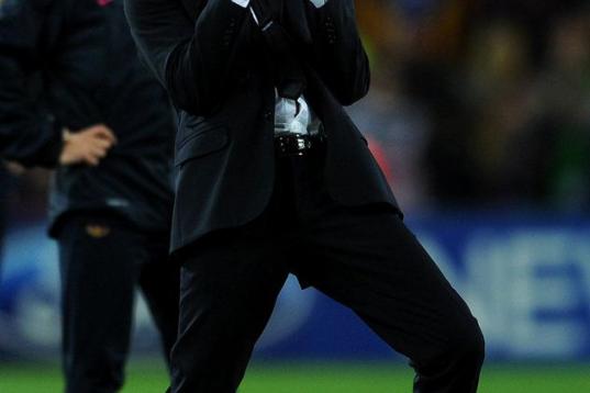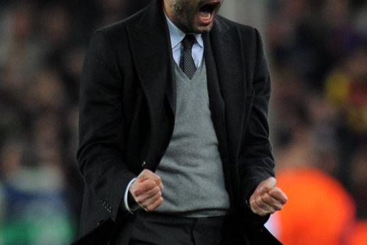 Barcelona's coach Pep Guardiola celebrates after his team scores a goal during their Champions League round of 16, 2nd leg football match FC Barcelona vs Arsenal on March 8, 2011 at Camp Nou stadium in Barcelona. AFP PHOTO / LLUIS GENE (Photo cr...
