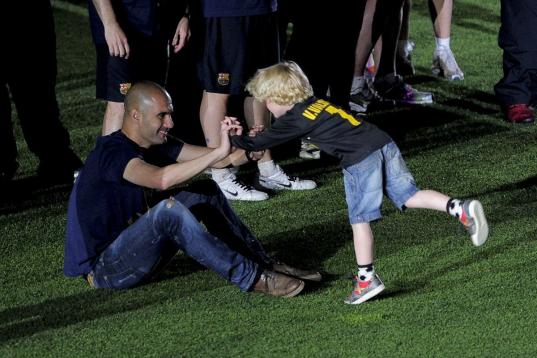 Barcelona's coach Josep Guardiola plays with a child while celebrating at Nou Camp stadium in Barcelona on May 13, 2011, after winning the Spanish League title. Barcelona were crowned Spanish champions for the third successive season with a 1-1 ...
