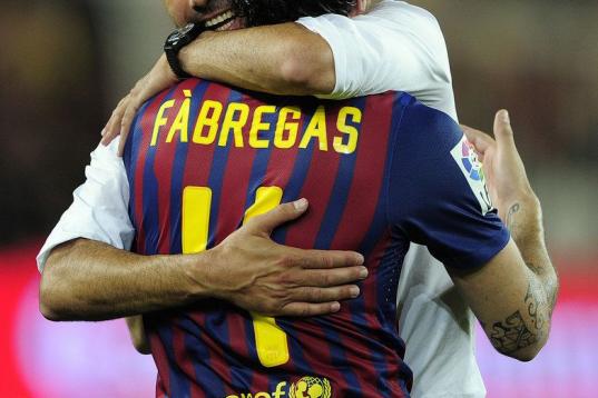 Barcelona's coach Josep Guardiola (L) celebrates with Barcelona's midfielder Cesc Fabregas after their victory on Real Madrid at the end of the second leg of the Spanish Supercup football match FC Barcelona vs Real Madrid CF on August 17, 2011 a...