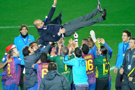 FC Barcelona players and staff members toss their head coach Pep Guardiola as they celebrate their victory against Santos FC during the awarding ceremony after the final football match in the Club World Cup in Yokohama on December 18, 2011. Bar...
