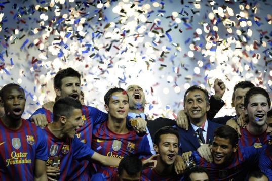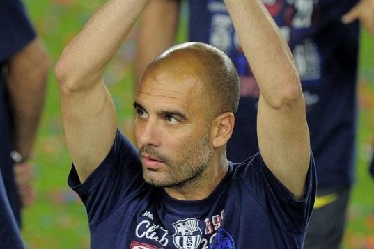 Barcelona's coach Josep Guardiola (C) celebrates his team's victory over Athletic Bilbao during their Spanish King's Cup final football match at the Vicente Calderon stadium, in Madrid, on May 25, 2012. Barcelona defeated Athletic Bilbao 3-0. ...