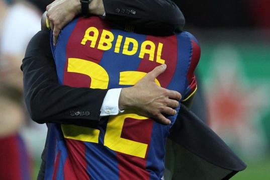 Barcelona manager Josep Guardiola celebrates with Eric Abidal after the final whistle