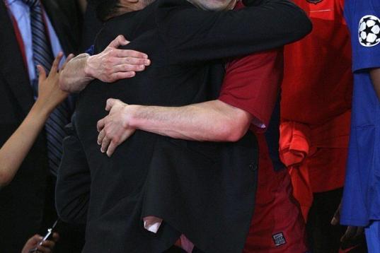 Barcelona's Andres Iniesta (right) celebrates with manager Josep Guardiola as they recieve their winners medals.