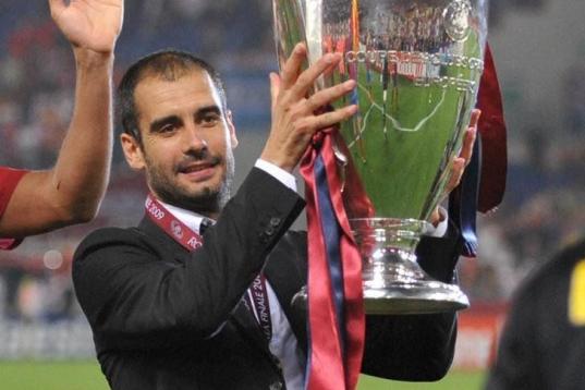 Barcelona´s coach Josep Guardiola holds the Champions League Cup after the trophy ceremony on May 27, 2009 at the Olympic Stadium in Rome. Barcelona defeated Manchester United 2-0 in the final of the UEFA football Champions League. AFP PHO...