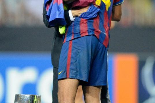 MONTE CARLO, MONACO - AUGUST 28: Josep Guardiola and Thierry Henry of Barcelona hold the trophy after defeating the Shakhtar Donetsk at the UEFA Super Cup Final at the Stade Louis II on August 28, 2009 in Monte Carlo, Monaco. (Photo by Laurence ...
