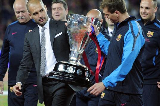 Barcelona's coach Josep Guardiola (L) and second coach Tito Vilanova (R) hold the Spanish league trophy as they celebrate their team's victory in the Spanish League after their Spanish league football match against RC Deportivo de la Coruna at t...