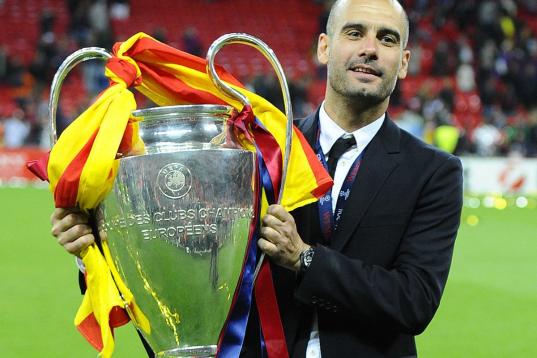 Barcelona's Spanish coach Josep Guardiola celebrates with the trophy at the end of the UEFA Champions League final football match FC Barcelona vs. Manchester United, on May 28, 2011 at Wembley stadium in London.Barcelona won 3 to 1. AFP PHOTO / ...