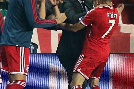 Bayern Munich's Franck Ribery (right) celebrates with his manager Pep Guardiola (centre) after scoring his team's opening goal
