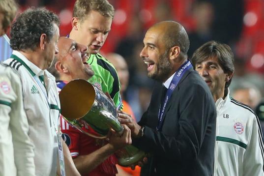 PRAGUE, CZECH REPUBLIC - AUGUST 30: Franck Ribery of Bayern Muenchen celebrates with his head coach Pep Guardiola after winning the UEFA Super Cup between FC Bayern Muenchen and Chelsea FC at Stadion Eden on August 30, 2013 in Prague, Czech Rep...