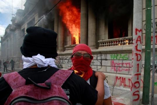 Cientos de manifestantes tomaron este sábado el Congreso de Guatemala y le prendieron fuego a varias de sus ventanas.