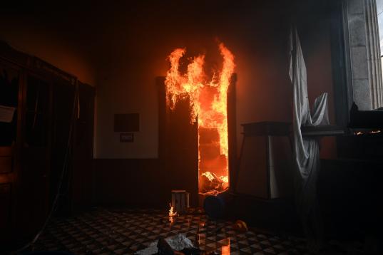 Los manifestantes, en su mayoría encapuchados, rompieron la puerta de ingreso al Parlamento y también las ventanas, lanzando antorchas de fuego al interior, sin la presencia de los diputados dentro de las instalaciones.