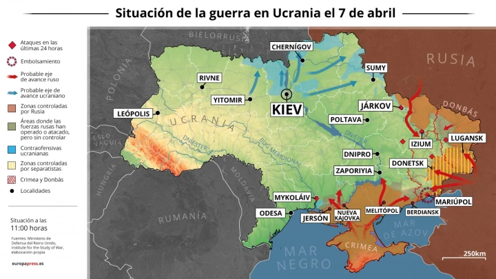 Otro de los síntomas de la inminente caída de Mariúpol se encuentra en el intento del pasado miércoles de evacuar en helicóptero a varios líderes del Batallón Azov, la fuerza neonazi legalizada que combate a los prorrusos desde 2014. No pudo lograrse, ya que Rusia derribó dichos aparatos. “Las fuerzas rusas afirmaron haber capturado el centro de Mariúpol el 7 de abril”, recuerda en su informe el instituto estadounidense, para establecer discrepancias, puesto que “los ucranianos conservan posiciones en el suroeste de la ciudad”.