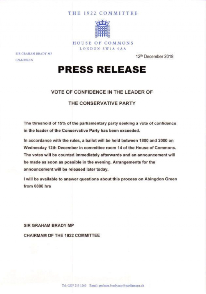 Hoy también es un día histórico en el Brexit. Este miércoles por la nocheMay se someterá a una votación interna de los diputados conservadores, después de que el Comité 1922, que reúne al grupo 'tory' -su partido- en la Cámara de los Comunes, recibiese las 48 cartas necesarias para iniciar el proceso.